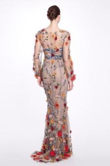 Quick view Compare Marchesa Long Sleeve Fully Embroidered Illusion Gown Long sleeve fully embroidered illusion gown with multicolor 3D organza flowers and silk ribbon wrapp…