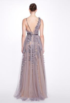 Quick view Compare Marchesa V-neck Shoulder-Strap Softly Constructed Column Gown V-neck shoulder-strap softly constructed column gown with engineered ruffle texture with 3D wisteria…